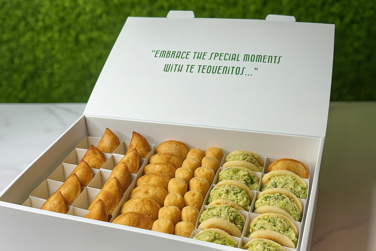 Our authentic Venezuelan tequeños are fully cooked and made with flaky dough wrapped around rich cheese or delicious blends like guava or plantain & cheese. Perfect for parties, gatherings, or a quick snack — they come ready to eat right out of your custom box.